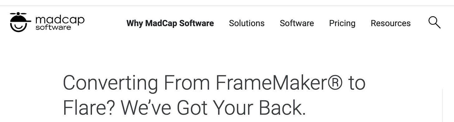 While contemplating my front, I was considering converting from Framemaker (tm) to Flare. But I was very concerned that if I made that decision, nobody would have my back. Until now: