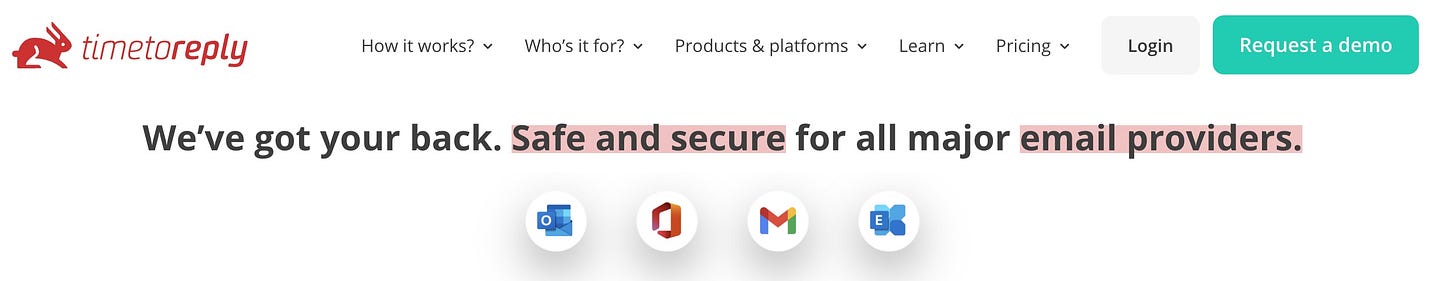 In an attempt to be helpful, I wanted to point out that this block on TimetoReply’s homepage has too much on it. I don’t know what the right amount of copy and visuals is…but it’s not this:
