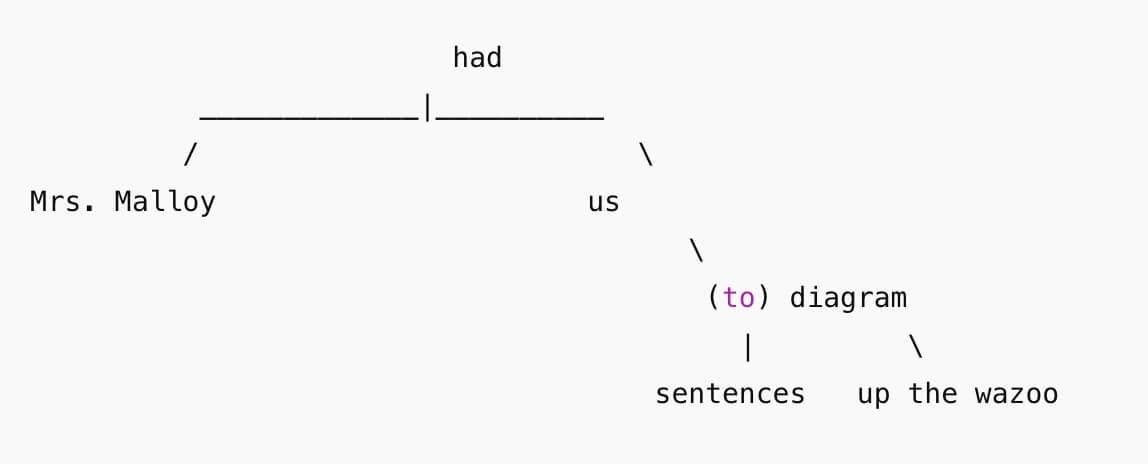 Approximately a million years ago, when I was in 6th grade, I had a teacher named Mrs. Malloy who taught English and is directly responsible for my incredible (and incredibly annoying to others) nitpickyness regarding grammar - Mrs. Malloy had us diagram sentences up the wazoo.