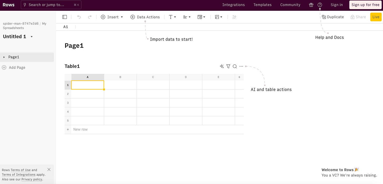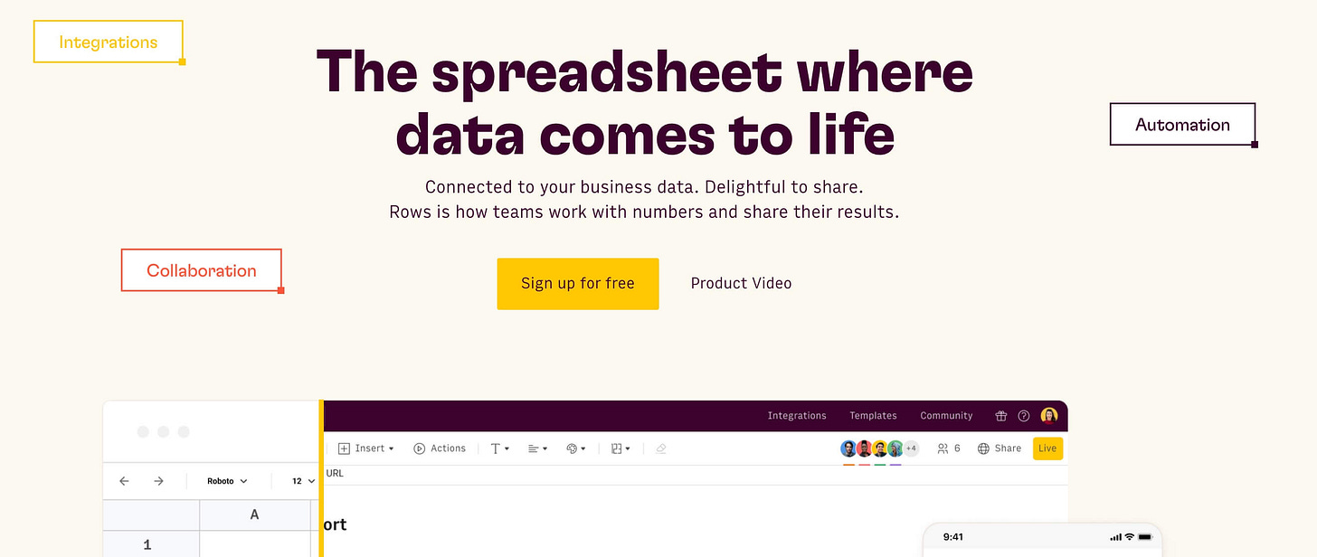 Kind of the usual whatever. It’s “delightful to share,” which is definitely not true. But it’s a website, and if you’ve heard of Rows you’ve probably come to the website to get a glimpse at how it works and how it’s different from Airtable or Excel or some other spreadsheety tool.