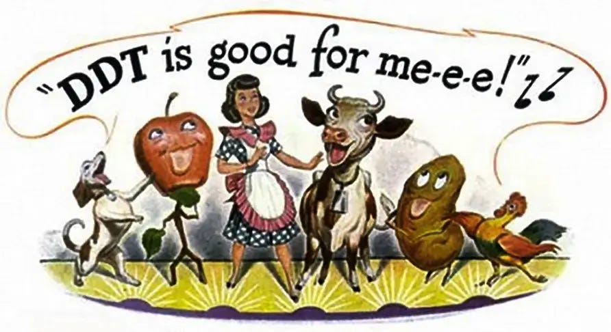 If we go back to the smiling DDT apple, the apple was smiling because DDT was protecting it from the terrible bugs who wanted to eat it (I mean, yes, at the expense of the health of generations of people who lived anywhere near it…but still).